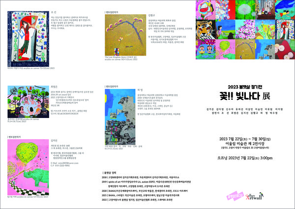 고양시 발달장애 청년작가 단체 ‘봄햇살’이 오는 7월 22일부터 30일까지 8일간 고양시 어울림누리 미술관 제2전시장에서 2023 봄햇살 정기전 ‘꽃!! 빛나다’를 개최한다. ‘봄햇살’은 2018년부터 작업과 전시를 시작으로 꾸준히 발전하고 있는 청년 발달장애 작가 단체로 보호자들과 함께 다양한 실험과 창작활동을 해오고 있다. 이번 전시에서는 다양한 형태의 그룹전을 선보이며 역량을 기르고 있는 작가들의 새로운 작품들을 만날 수 있다