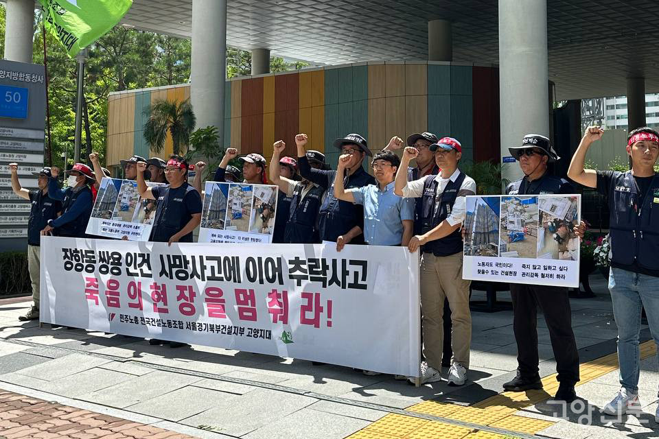 민주노총 건설노조 서경지부 고양지대(지대장 이영춘) 소속 건설노동자 20여명은 5일 덕양구 화정동 고용노동부 고양지청 앞에서 기자회견을 열고 연이은 중대재해 발생에 대한 대책마련을 요구했다.