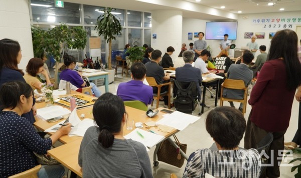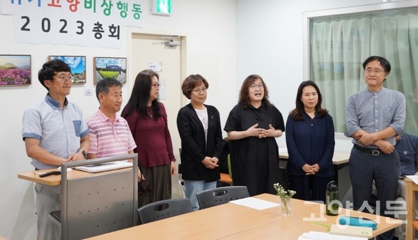 [고양신문] 전지구적 위협으로 다가오는 기후위기에 대응하기 위한 고양시 시민·사회단체 연대조직인 ‘기후위기 고양비상행동’(이하 고양비상행동)이 재출범의 첫발을 딛는 총회를 열었다. 13일 주엽커뮤니티센터에서 진행된 총회에는 다양한 시민·사회단체, 진보적 의제를 공유하는 정당 대표단 등 40여 명의 회원들이 참석해 신임 임원단을 선출한 후 새로운 실천활동을 선언했다.