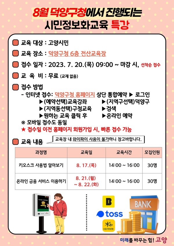 정보화교육 담당자는 “8월에 진행되는 특강은 정규 교육 과정 외 덕양구에서 시민들을 위해 준비한 특별한 과정이다. 이번 교육은 온라인 시대에 발맞춰 키오스크 사용법과 디지털 금융앱 사용을 익히고, 디지털 범죄를 예방하는 방법을 다루고 있으니, 많은 관심과 참여 부탁드린다”라고 전했다.