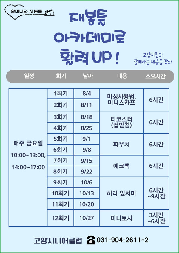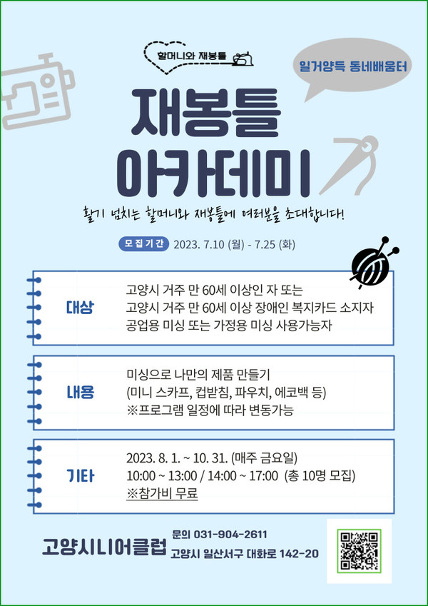 재봉틀 아카데미는 2023년 7월 현재 참여자 모집중이며, 강좌에 대한 문의 사항이 있는 경우 고양시니어클럽(031-904-2611~2)으로 하면 된다.