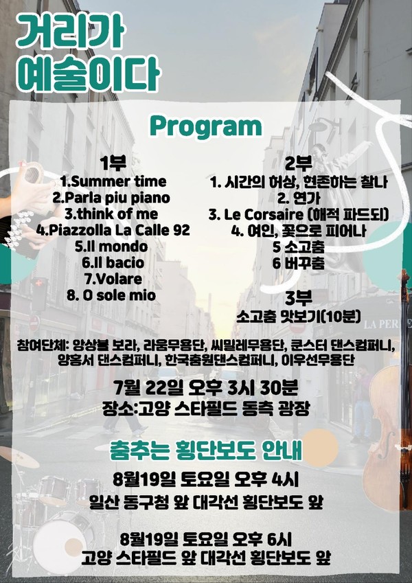 이번 ‘거리가 예술이다’ 참여단체는 앙상블 보라와 라움무용단, 씨밀레무용단, 쿤스터 댄스 컴퍼니, 양홍서 댄스컴퍼니, 한국춤원댄스컴퍼니, 이우선 무용단이며, 사)대한무용협회 고양시지부가 주최하고 사)고양시음악협회, 사)보훈무용예술협회 고양시지부가 후원한다. 한편, 8월 19일(토)에는 일산동구청 앞 대각선 횡단보도 앞에서 오후 4시부터, 오후 6시에는 고양스타필드 앞 대각선 횡단보도 앞에서 ‘춤추는 횡단보도’가 있을 예정이다.