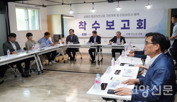 [고양신문] 3200억원의 대규모 예산이 투입될 예정인 창릉천 통합하천사업의 기본계획과 타당성조사를 위한 용역 착수보고회가 19일 행주동에 자리한 고양한강방문자센터에서 19일 열렸다. 이날 보고회에 앞서 창릉천 통합하천사업 자문단 사무실(한강방문자센터 2층) 개소식이 열렸고, 보고회 종료 후에는 전문가 자문단회의가 이어졌다. 이날 이동환 시장과 이정형 부시장, 정일문 한국건설기술연구원 본부장이 시종 자리를 지켰고, 자문단장을 맡고 있는 이재오 민주화기념사업회 이사장을 비롯해 각계 전문가로 구성된 자문단원들이 보고를 경청한 후 의견을 나눴다.