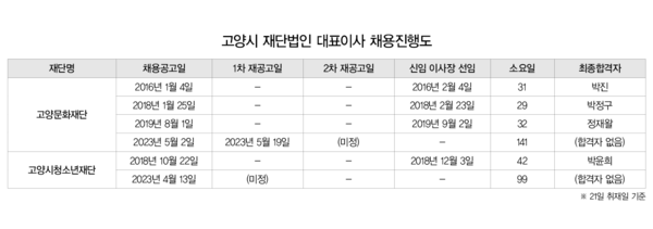 고양시청소년재단의 상황도 크게 다르지 않다. 청소년재단은 작년 12월 박윤희 이사의 사직서 제출(올해 2월까지는 근무) 이후 4월 13일 대표이사 모집공고를 냈고, 인원추천위원회 심사 결과 ‘적격자 없음’으로 결론이 나 재공고를 앞두고 있다. 2018년에 진행한 지난 채용의 경우 별도의 재공고 없이 한 번에 합격자가 결정나 대표이사 공석기간은 44일이었으나, 이번 채용의 경우 1차에서 합격자가 나오지 않아 21일 기준 140일간 대표이사직은 공석이다.