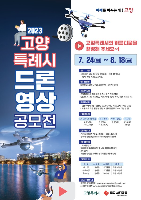 [고양신문] 고양시가 7월 24일부터 8월 18일까지 2023 고양시 드론영상 공모전을 개최한다. ‘드론으로 고양특례시 명소를 찾아라’라는 주제로 열리는 이번 공모전에서는 고양시의 아름다운 자연경관, 지역명소, 숨은 관광지 등을 담은 드론 영상과 사진을 접수받는다.