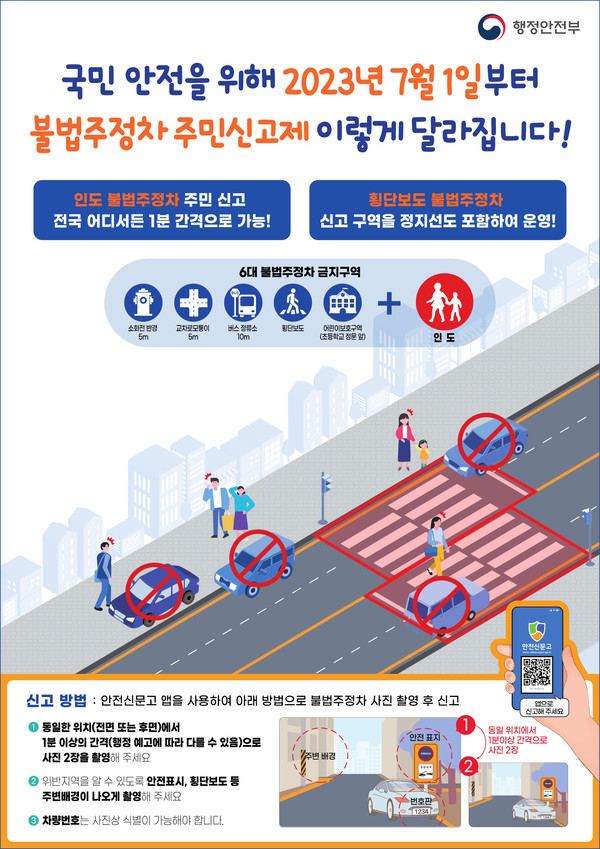 고양특례시(시장 이동환)가 보행자 안전을 강화하기 위해 8월부터 불법주정차 주민신고제 기준을 확대해 운영한다. 기준이 확대됨에 따라 인도에 불법주정차된 차량도 신고할 수 있다. 2019년도부터 시행된 불법 주정차 주민신고제는 불법 주정차를 목격한 사람이라면 누구나 ‘안전신문고’ 앱을 이용해 신고할 수 있도록 한 제도이다.