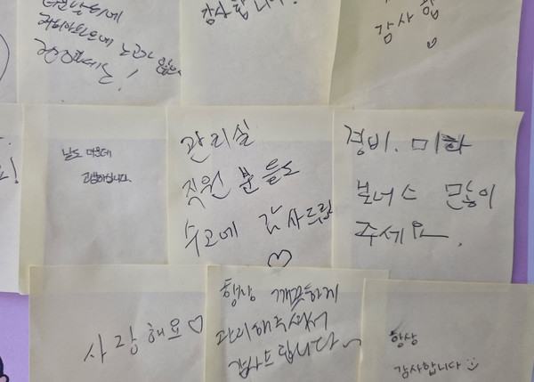 주민들은 “경비원님, 환경미화원님 살기 좋은 아파트를 만들어 주셔서 감사합니다. 행복하세요.♡”,“우리 아파트를 위해 힘쓰고 노력해주셔서 감사합니다. 늘 건강하세요.”,“존재하는 모든 곳곳마다 손길이 안 닿는 곳 없이 근사한 환경을 만들어 주셔서 고맙습니다. 덕분에 단지 생활이 더 아늑해졌어요. 더운 날 건강 유의하세요.”,“정말로 감사하면 승강기를 깨끗이 사용합시다!” 등의 감사 인사와 뜻깊은 다짐을 전했다.