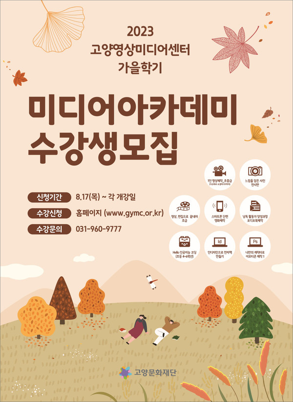 [고양신문] 고양문화재단 고양영상미디어센터는 17일부터 각 강좌 개강일까지 홈페이지를 통해 미디어아카데미 가을학기(9월~11월) 수강생을 선착순 모집한다. 가을학기 강좌는 총 8개로 평일 오전과 오후, 토요일 오전 등 다양한 시간대에 운영된다.