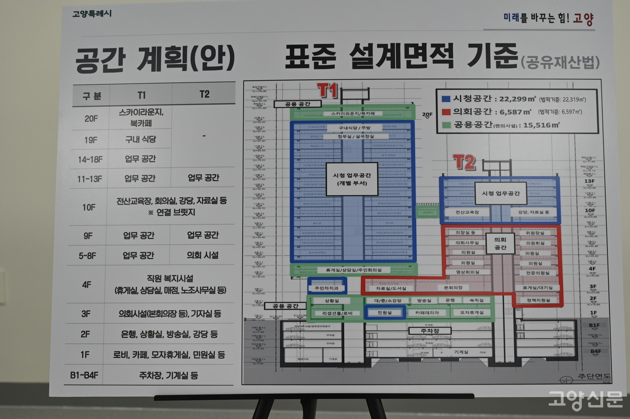 아울러 층별 구성 계획안을 통해 백석 업무빌딩 내 공간도 소개했다. 고양시에 따르면 T1, T2 두 개의 건물은 각각 20층, 13층 높이로 4층까지는 공용 공간으로 사용한다. 시가 발표한 층별 구성 계획안에서는 4층까지의 공간에 주민커뮤니티공간, 카페, 민원실, 은행 등이 들어설 예정이다. 공용건물 3층 본회의장을 비롯해 T2에는 의회시설을 조성한다.