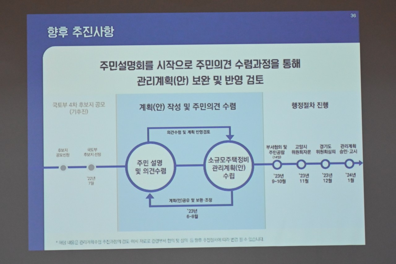국토교통부는 앞서 2017년 소규모주택정비 특례법 제정 이후 2021년부터 매년 저층 노후 주택 주거환경 개선을 위해 소규모주택정비 관리지역 후보지 공모사업을 진행해왔다. 이중 고양시는 행신동 가라뫼 지역 주민들의 요청으로 4차 공모에 신청해 지난해 7월 후보지로 선정됐다. 이후 올해 4월부터 해당지역 소규모주택정비 관리계획(안) 수립을 위한 용역(용역회사 어반플랫폼)을 진행하고 있으며 주민공람과 경기도 심의 등을 거쳐 내년 상반기 최종 승인·고시를 목표로 하고 있다.