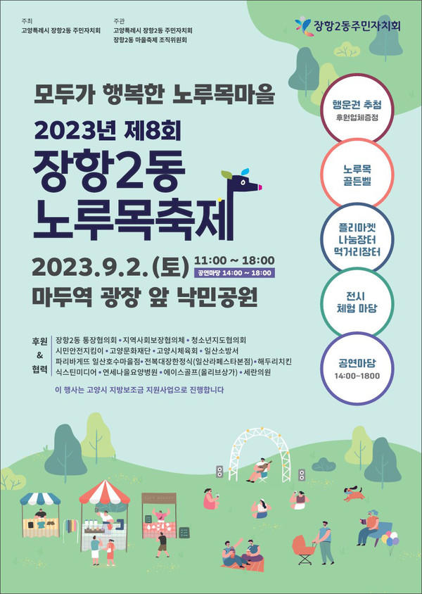[고양신문] 장항2동 주민자치회와 노루목축제 조직위원회는 오는 9월 2일(토) 낙민공원에서 ‘2023년 제8회 장항2동 노루목축제’를 개최한다. 고양시 지방보조사업으로 진행되는 이번 축제는 11시부터 18시까지 다양한 문화공연과 체험마당, 장터마당, 노루목 골든벨 등 다채로운 프로그램으로 진행할 예정이다. 개막식은 13시 40분 고양시태권도시범단의 사전 축하공연을 시작으로 14시부터 진행한다.