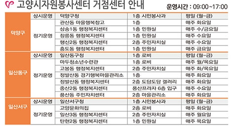 유선종 고양시자원봉사센터장은 “시민들이 쉽게 자원봉사 정보를 이용하며 센터 방문으로 인한 불편을 해소하고, 일상 속 자원봉사 참여문화 증진을 위해 거점센터를 운영하고 있다. 정발산동 거점센터가 일산동구 내 나눔과 자원봉사 실천의 메카가 될 수 있도록 전문적이고 체계적인 지원을 아끼지 않겠다”라는 포부를 전했다.