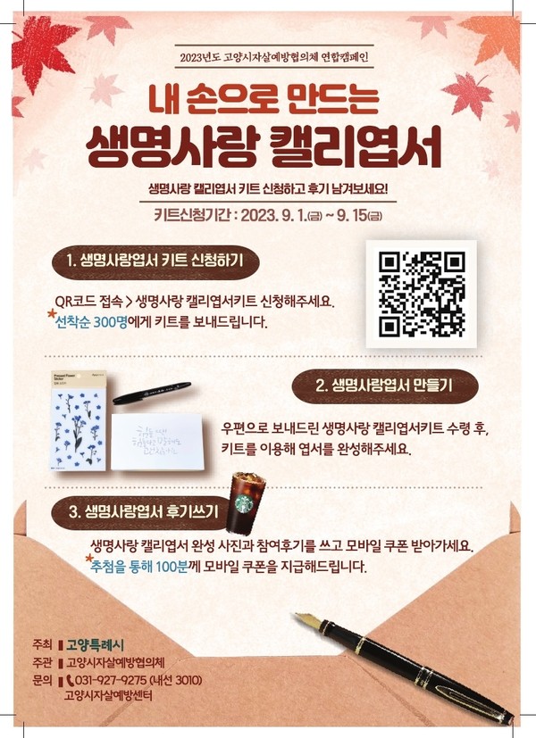 [고양신문] 고양시자살예방협의체가 자살예방에 대한 시민 관심을 높이고, 생명존중문화를 조성하기 위해 ‘내 손으로 만드는 생명사랑 캘리엽서’ 이벤트를 진행한다. 참가를 원하는 시민은 고양시자살예방센터 홈페이지 배너 혹은 큐알코드를 이용해 이달 15일까지 이벤트 누리집에 접속하면 된다.