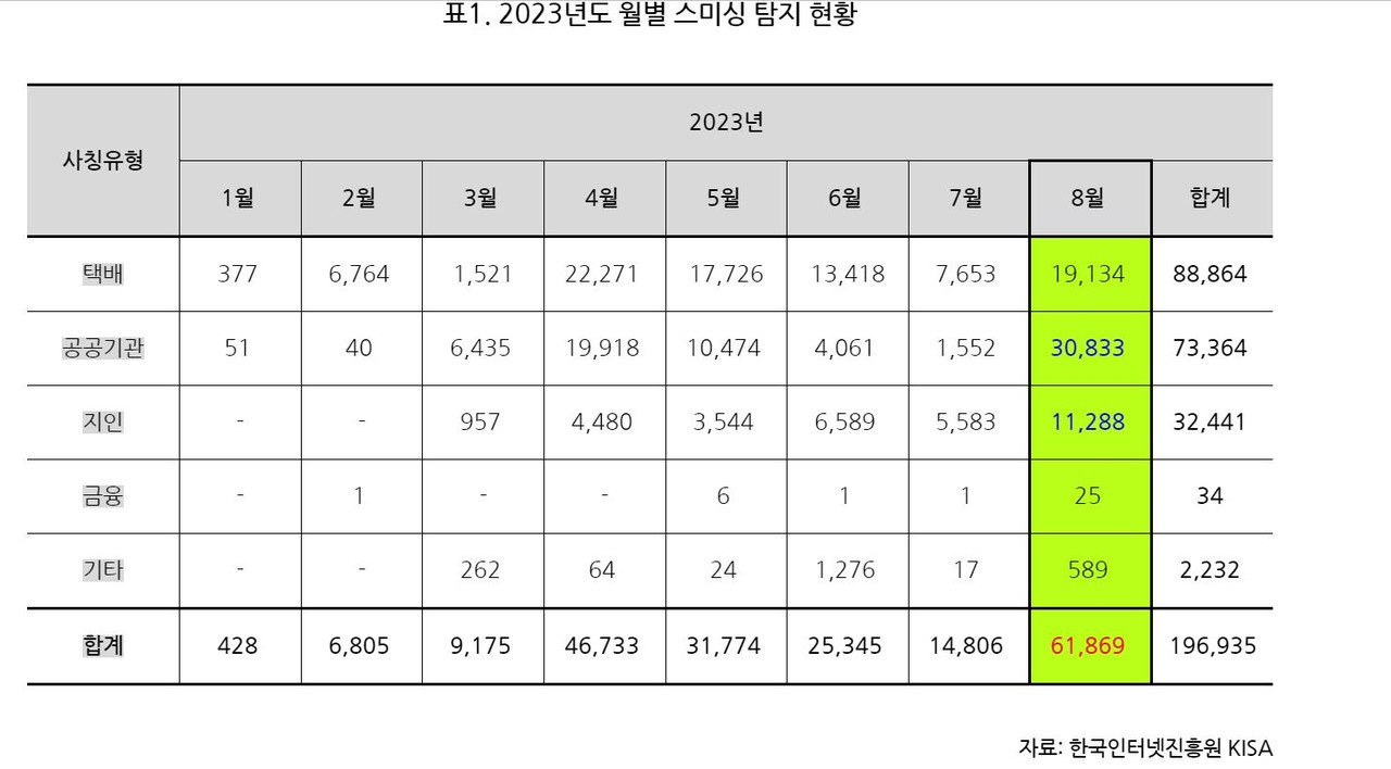 특히 8월은 다른 달에 비해 △공공기관 사칭 △지인 사칭 등의 스미싱 유형이 급격히 늘었는데, 통상 택배 사칭유형이 많은 것에 비해 이례적이다.