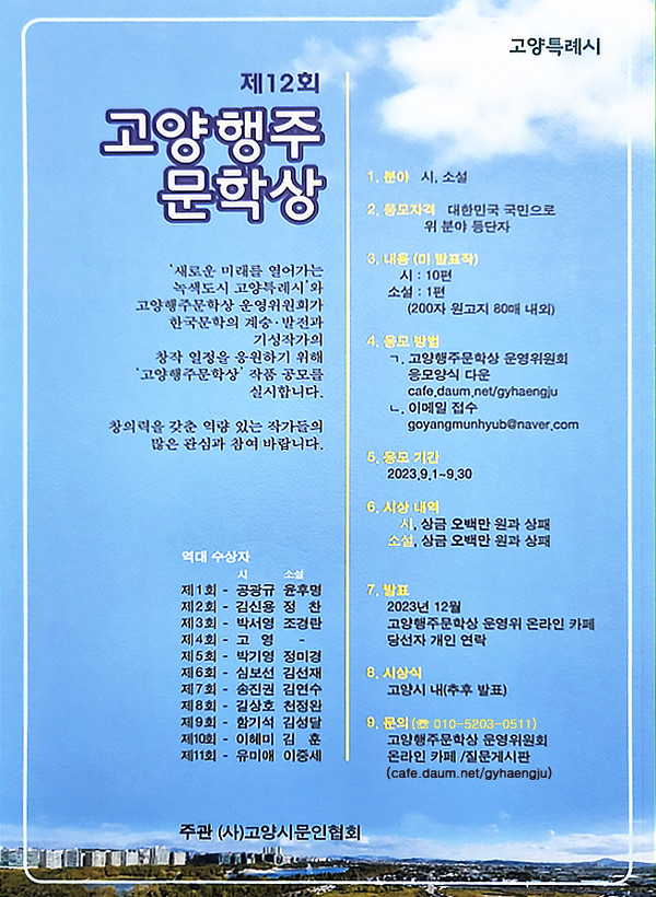 기타 문의사항은 한국문인협회 고양지부(☏010-5203-0511)로 하면 된다.