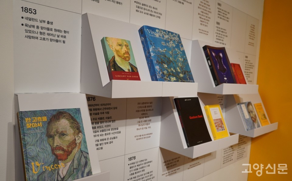 벽면 액자에는 ‘아를의 여인’, ‘소설 읽는 여자’, ‘ 책 세권’, ‘성서’ 등 화폭 속에 책이 등장하는 고흐의 그림 10여 점이 정교한 래플리카 작품으로 걸려 있다. 일상의 소중한 부분으로 묘사된 그림 속 책들에서 보듯, 책은 고흐의 삶 곳곳에 흔적을 남기고 있고, 이는 화가인 동시에 수백통의 편지글 속에 영혼의 고뇌를 담아내는 바탕이 됐을 것이다.