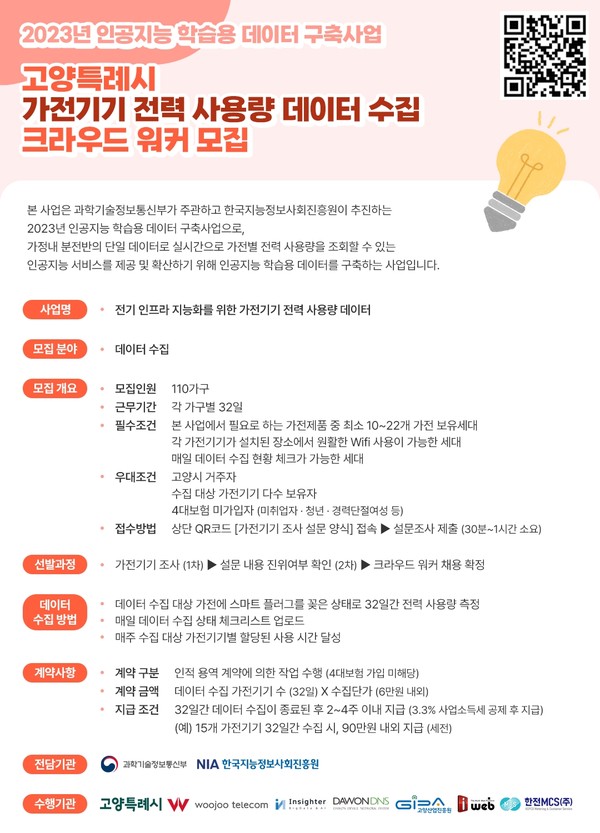 고양시가 선정된 사업은 ‘전기 인프라 지능화를 위한 가전기기 전력 사용량 데이터’이다. 해당 사업은 관내 110가구로부터 32일간 10~22종의 가전기기 전력 사용량 데이터를 수집한 후 인공지능 알고리즘 기반 학습용 데이터를 구축하는 사업이다.