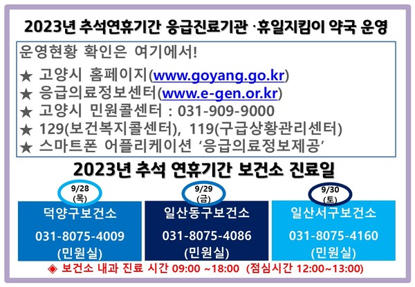 명절 기간 운영하는 의료기관 및 약국 현황은 응급의료정보센터(www.e-gen.or.kr) 또는 고양시 홈페이지(www.goyang.go.kr)에서 확인할 수 있다. 고양시 민원콜센터(031-909-9000)를 통해서도 확인 가능하다.