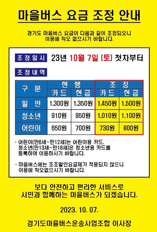 인상 요금은 경기도 시내버스 요금에 준하는 카드 기준 △일반인 1300원⇨1450원 △청소년 910원⇨1010원 △어린이 650원⇨730원으로 오른다.