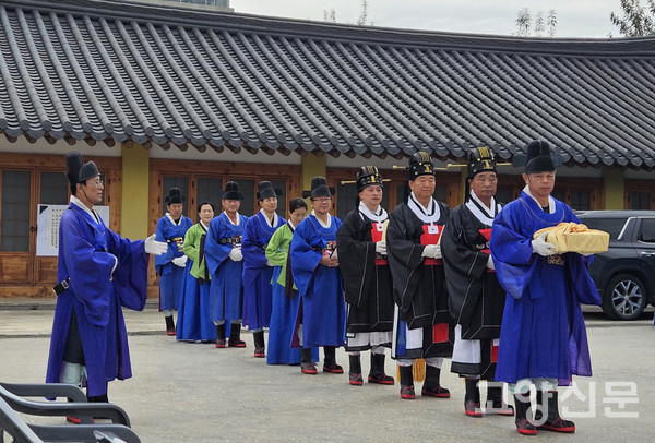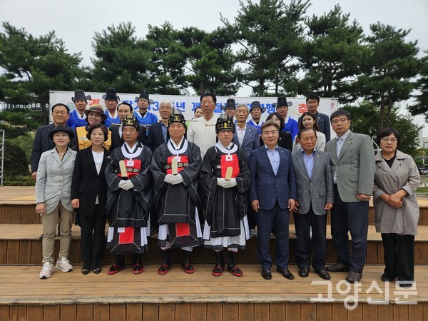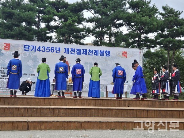[고양신문] 우리 민족의 첫 국가인 ‘조선’의 건국을 기념하는 개천절 제천례가 3일 고양문화원 야외특설무대에서 봉행됐다. 초헌관은 김보연 고양시산림조합장, 아헌관은 이영휘 전국농업기술자협회장, 종헌관은 권용순 대한청년총연합회총재가 맡아 봉행했다. 한국민속문화협회(회장 정운란)가 주관하고 고양문화원(원장 김용규)과 고양시향토문화진흥원(원장 안재성)이 주최한 행사였다.