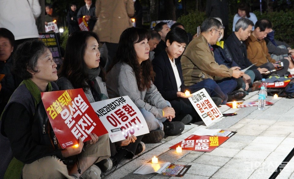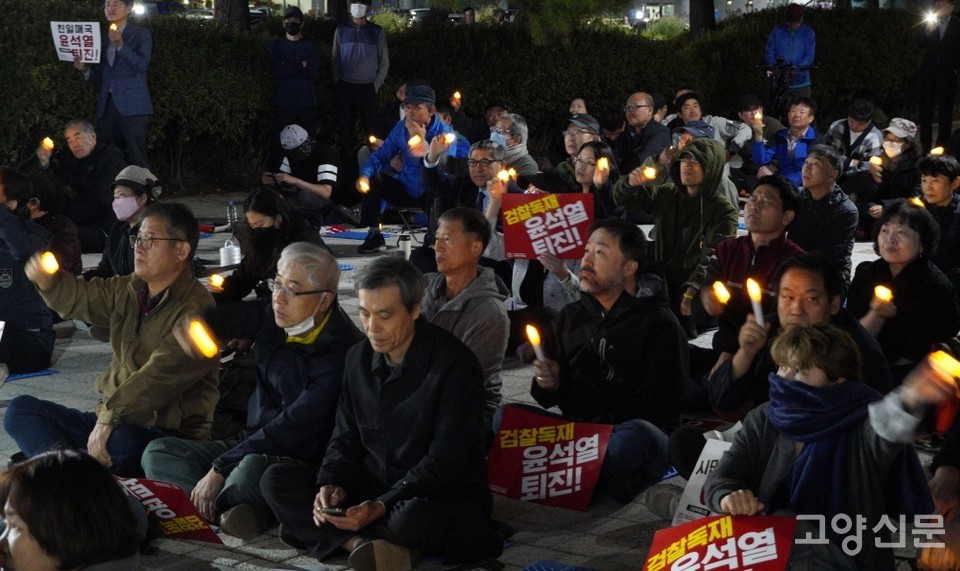 [고양신문] 고양비상시국회의(상임대표 김훈래)가 주최한 제1회 고양촛불문화제가 5일 저녁 덕양구청 옆 공원길에서 열렸다. 이날 행사에는 갑자기 저녁기온이 떨어진 쌀쌀한 날씨에도 불구하고 300여 명의 시민과 고양시민사회연대회의, 민주노총 고양파주지회 등 다양한 분야의 시민·사회단체 활동가들이 참가했다. 또한 진보당과 더불어민주당 등 다수의 야당 정치인들도 문화제에 함께했다.