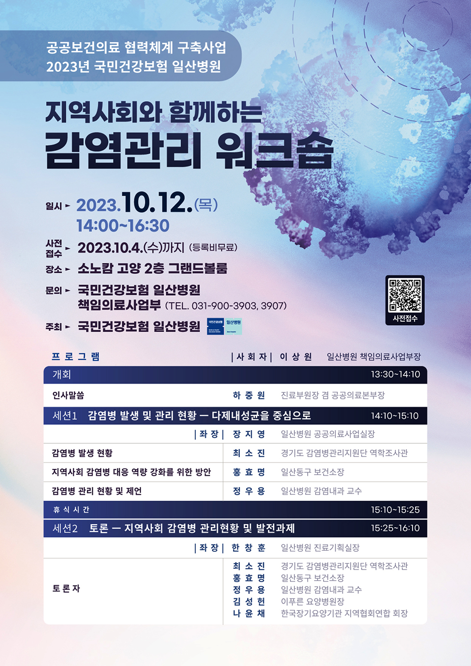 한편 이번 워크숍은 경기도 권역‧지역책임의료기관, 경기도감염병관리지원단, 고양권 보건소, 중소병원, 요양병원, 보건의료 유관단체, 장기요양시설 등 원내·외 참여를 희망하는 자를 대상으로 한다. 문의 : 국민건강보험 일산병원 책임의료사업부(031-900-3903,3907)