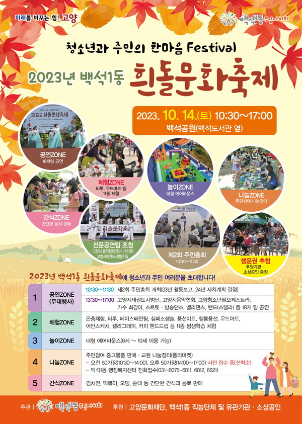 [고양신문] 백석1동 주민자치회는 오는 14일 오전 10시 30분부터 오후 5시까지 백석공원 광장(백석도서관 옆)에서 ‘청소년과 주민의 한마음 페스티벌’을 주제로 ‘2023 흰돌문화축제’를 개최한다. 올해로 8회째를 맞이한 흰돌문화축제는 행사장을 찾은 관람객이 다양하게 체험하고 참여할 수 있는 프로그램을 중심으로 운영된다.