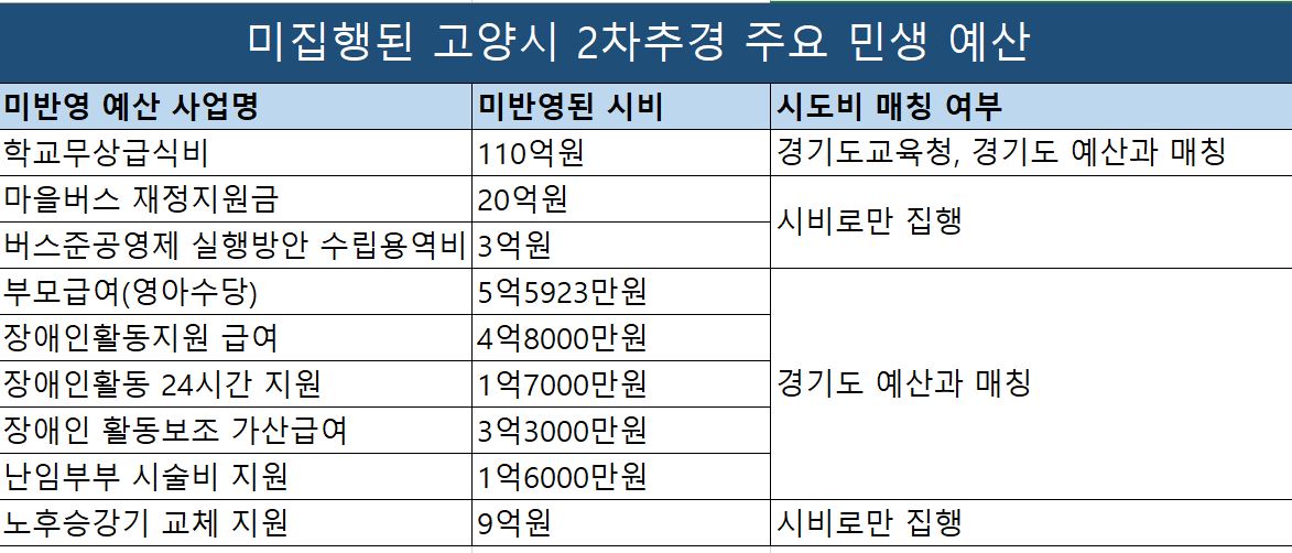 [고양신문] 고양시 2차 추경예산안이 처리되지 못한 여파가 고양시민의 피해로 이어지고 있다. 고양시는 지난달 7일부터 21일까지 계획된 제276회 의회 임시회에서 2차 추경예산 1946억원을 승인하지 못함에 따라 △학교무상급식 △마을버스 운행 △취약계층 복지 △노후승강기 교체 등 여러가지 시민 피해가 현실화되고 있다. 이중에서 가장 시급한 것은 학교무상급식과 마을버스 지원이다.