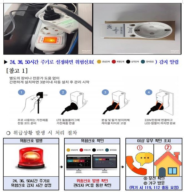 가정에서 주로 사용하는 가전제품을 스마트 플러그에 꼽으면 관리시스템을 통해 사용량이 감지된다. 만약 일정 시간 동안 전력 사용량과 조도의 변동이 없을 경우 해당 동 복지담당자에게 ‘위험 알림 문자서비스’가 발송된다.