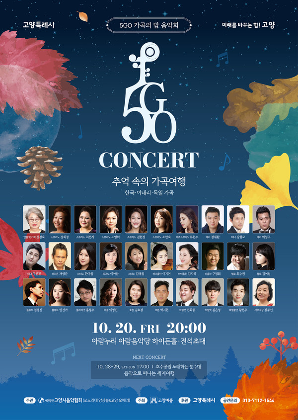 이번 콘서트는 ‘추억 속의 가곡 여행’이라는 주제로 한국과 이탈리아, 독일의 가곡을 선보이며, 장애 테너 황선우군을 비롯해 소프라노 정회정, 테너 정재환, 바리톤 채영준, 피아노 한아름, 바이올린 이지연, 비올라 구정회, 첼로 최수원, 플루트 임경진, 클라리넷 홍성수, 바순 이명진, 호른 김효정, 트럼펫 전화종 등이 아름다운 가을밤 5GO 음악회의 묘미를 살린다.