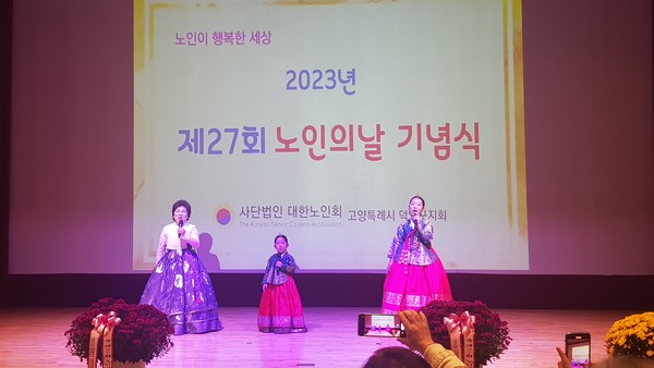 [고양신문] (사)대한노인회 덕양구지회(지회장 장도영)는 20일 고양시청 문예회관에서 노인의날 기념식을 개최했다. 박노철 덕양구지회 사무국장 사회로 진행된 이날 기념식은 식전 축하 공연으로 트로트, 명창 민요, 고양실버 아코디언 공연단(단장 공길남) 등이 다양하게 펼쳐졌다. 이어 홍성걸 수석부회장이 노인강령을 낭독했으며 노인복지와 지역사회 발전을 위해 헌신한 어르신에게 표창장 수여식이 있었다.
