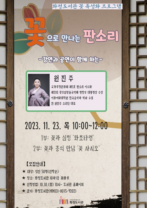[고양신문] 고양시 화정도서관은 원진주 명창을 초청해 오는 11월 23일 오전 화정도서관 지하1층 꽃마루에서 ‘꽃으로 만나는 판소리’를 운영한다.
