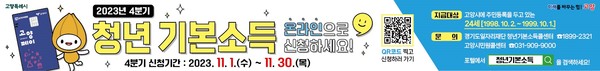[고양신문] 고양시(시장 이동환)는 청년의 정기적인 소득지원을 통한 사회활동 촉진 및 사회적 기본권 보장을 위해 11월 1일부터 11월 30일까지 4분기 청년기본소득을 신청받는다.