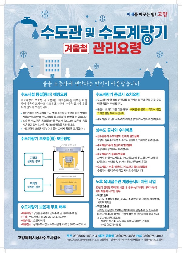 [고양신문] 고양시(시장 이동환)는 겨울철 수돗물 동파를 최소화하기 위해 오는 12월부터 내년 3월까지 ‘2023~2024 동절기 수도계량기 동파 방지 대책’을 실시한다.