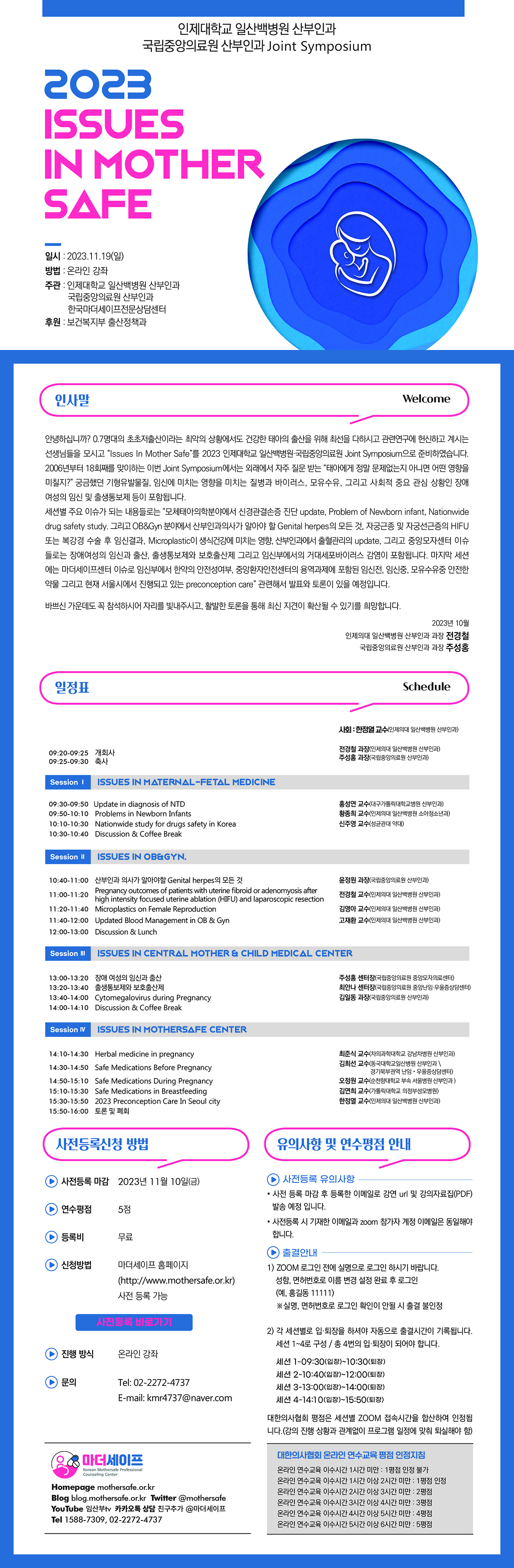 심포지엄 참가비는 무료이며 신청은 10일까지 마더세이프 홈페이지에서 하면 된다. 참석자는 대한의사협회 연수 평점 최대 5점을 받을 수 있다.
