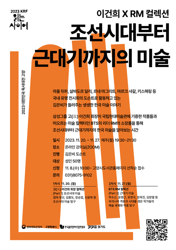 [고양신문] 고양시 한뫼도서관은 오는 11월 20일과 27일 오후 7시30분부터 온라인 줌(ZOOM)을 통해 ‘조선시대부터 근대기까지의 미술: 이건희×알엠(RM) 컬렉션’을 운영한다.