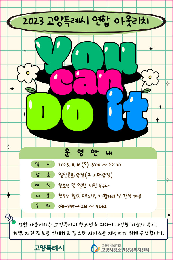 [고양신문] 고양시청소년재단(대표이사 최회재) 고양시청소년상담복지센터(센터장 황상하)는 오는 16일(목) 오후 6시부터 일산문화광장에서 청소년 유관기관과 함께 연합 아웃리치 '유 캔 두 잇(You can do it)'을 운영한다. 연합 아웃리치는 수능 수험생을 격려하고 탈선을 예방해 청소년과 보호자에게 필요한 정보와 체험거리를 제공함은 물론, 위기(가능) 청소년을 발견·지원할 예정이다.