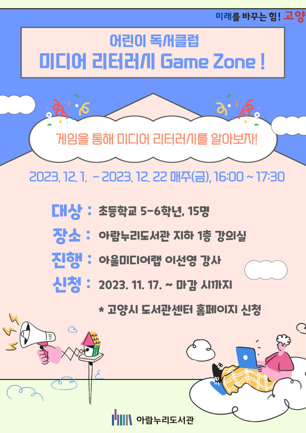 [고양신문] 고양시 아람누리도서관은 12월 1일부터 22일까지 초등학교 5~6학년을 대상으로 ‘매체 이해력(미디어 리터러시) 게임 존’을 운영한다.