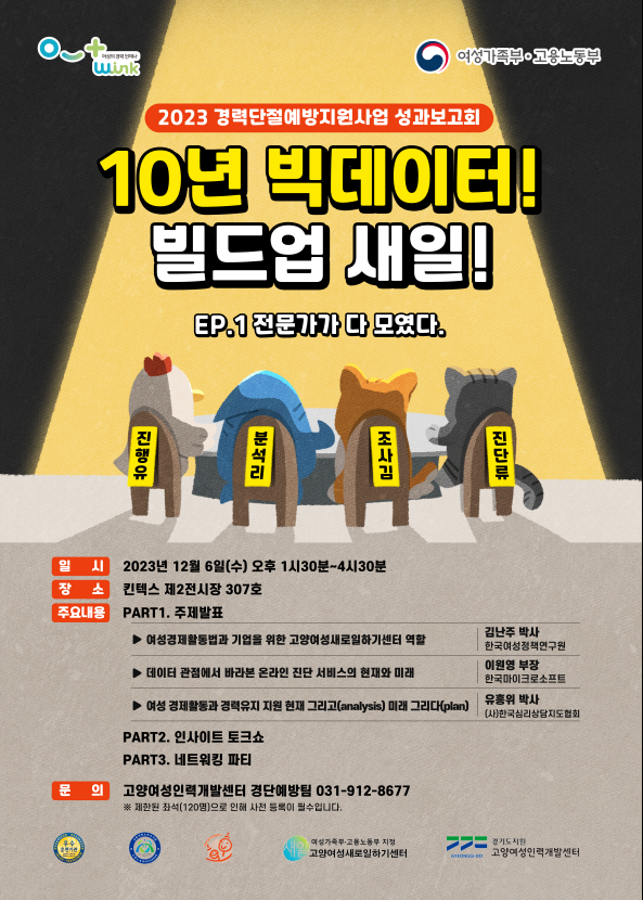 특히, 이번 토크쇼는 지난 10년간의 고양여성인력개발센터 온라인 플랫폼 [K1(구직자 준비도), K2(재직자 직무적응), K3(재직자 직무소진), K4(재직자 퇴직의도), K5(성격유형 및 대인교류분석)]의 빅데이터 분석과 2023년에 진행된 기업체 수요조사를 기반으로, 향후 10년을 준비할 수 있는 현장 의견 수렴 등을 목적으로 진행한다. 더불어 경력단절예방사업의 향후 방향에 대한 인사이트를 도출하기 위한 중요한 행사로 기대되고 있다.