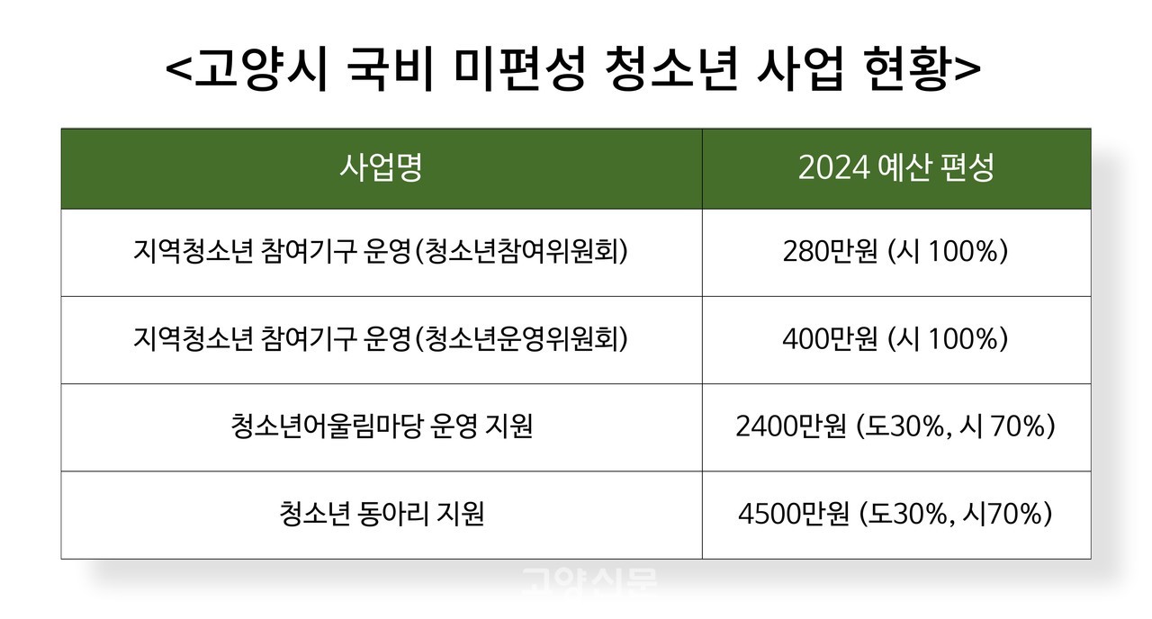 고양시 경우도 국비가 삭감되면서 내년 청소년 사업 예산을 도비 및 시비로만 편성한 상황이다.