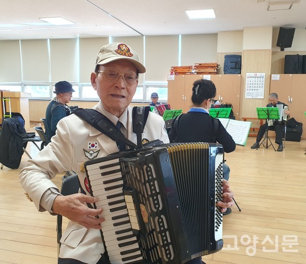 [고양신문] 오찬권(89세) 대화노인종합복지관 아코디언 봉사단원은 “주름상자 같은 곳에서 나오는 소리에 마음을 빼앗겨" 10년째 아코디언 봉사단원으로 활동 중이다. 내년 갑진년이면 90세가 되는 오찬권 단원은 6‧25 참전용사다. 상이등급 6급으로 상이군경 국가유공자다.