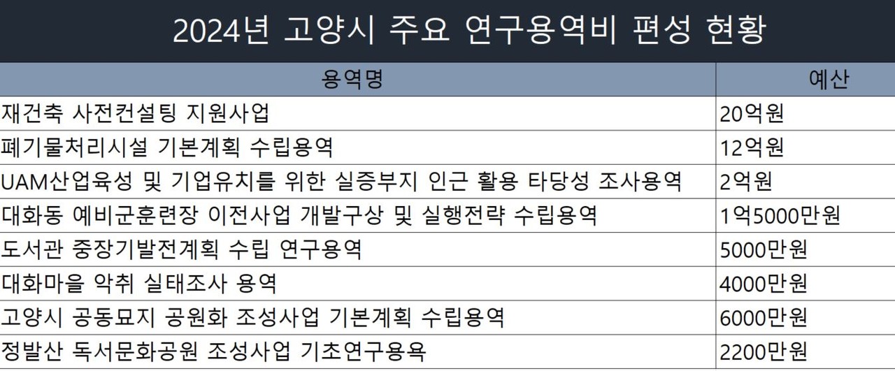 내년 고양시 주요 연구용역 예산