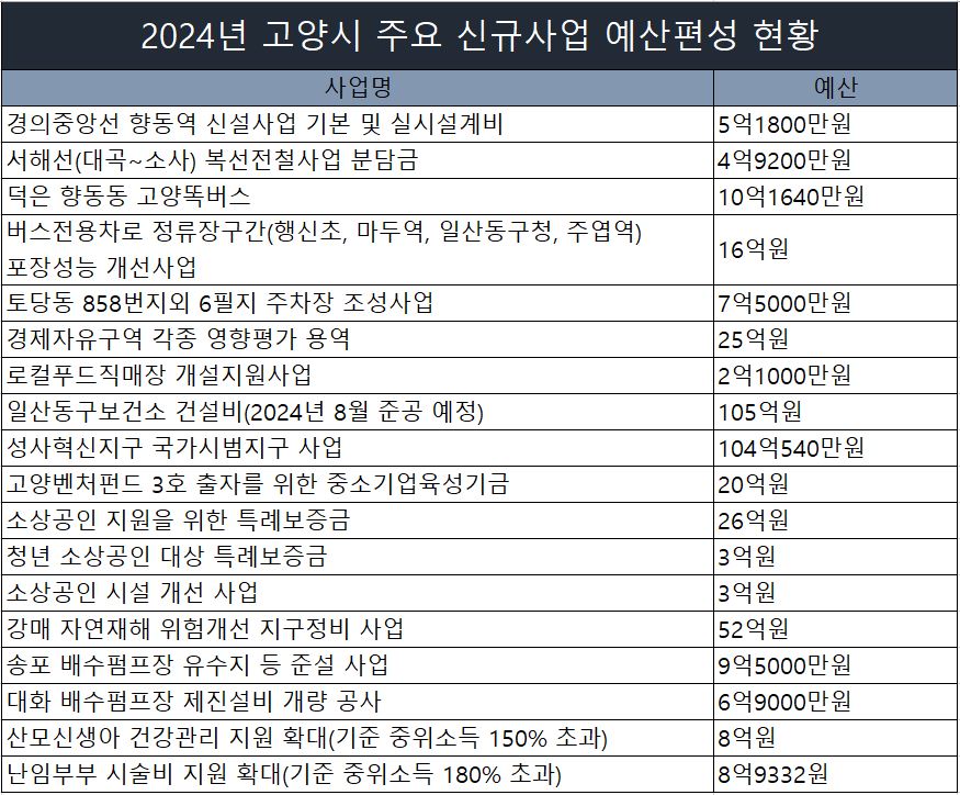올해 신규 사업 예산을 살펴보면, 우선 교통분야에서는 ‘경의중앙선 향동역 신설사업 기본 및 실시설계비’ 예산 5억1800만원을 책정했다. 고양시는 2018년 향동역 신설 타당성 검토용역을 실시(B/C 1.56) 한 후 국토부로부터 사업계획을 승인받았다. 이후 2021년 총사업비 148억원을 시가 부담하고 국가철도공단에 설계(1년)와 공사(3년)를, 한국철도공사에 운영을 위수탁하는 협약을 체결했다. 총사업비(148억원) 중 5억1800만원은 화전역과 수색역 사이 향동역을 신설하기 위해 노선관리자인 국가철도공단에 실시설계를 위탁하는 데 들어가는 비용이다.