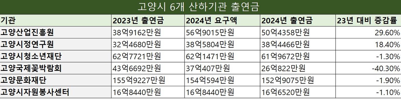 고양시가 당초 각 산하기관별로 요구한 2024년 출연금을 보면, 고양문화재단 154억593만원, 고양시청소년재단 62억1471만원, 고양산업연구원 56억2217만원, 고양국제꽃박람회 26억1122만원, 고양시정연구원 38억5803만원, 고양시자원봉사센터 16억8400만원이다.