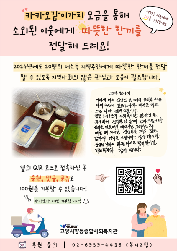 향동종합사회복지관은 밑반찬지원사업 재원마련을 위해 현재 카카오같이가치 온라인 모금 플랫폼에서 2024년 2월 23일까지 활발한 모금 활동을 진행 중이다.