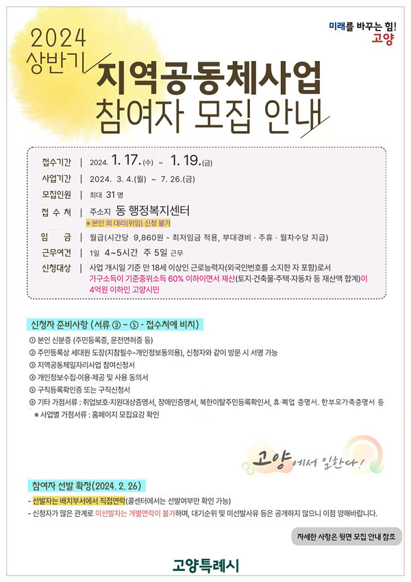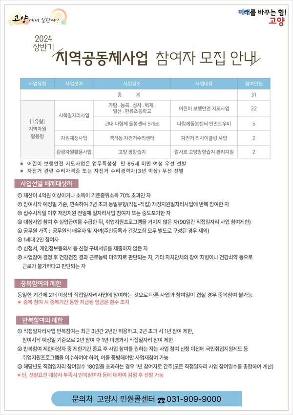 [고양신문] 고양시가 ‘2024년도 상반기 지역공동체 일자리사업’ 참여자를 모집한다. 공동체 유지 및 지역자원 활용에 목적을 둔 지역공동체 일자리사업은 저소득층 등 취업 취약계층에 일자리를 제공해 고용과 생계 안정을 지원하는 직접일자리사업이다.