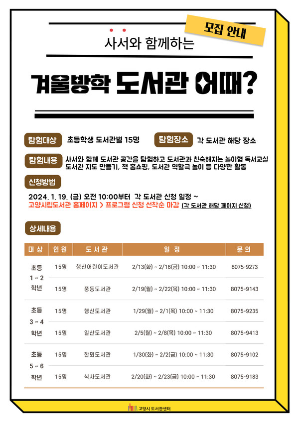 [고양신문] 겨울방학 시즌을 맞아 고양시의 6개 시립도서관이 연합해 <겨울방학 도서관 어때?>라는 타이틀로 겨울방학 독서교실을 운영한다. 오는 29일부터 다음 달 23일까지 진행하는 독서교실은 어린이들이 도서관 사서의 일을 직접 체험해볼 수 있는 흥미로운 프로그램이다.
