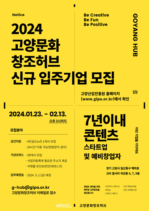 신청 접수는 고양문화창조허브 이메일(g-hub@gipa.or.kr)로 가능하다. 평가를 거쳐 2월 중 최종 기업을 선정해 3월부터 입주할 예정이다. 자세한 내용은 진흥원 누리집(www.gipa.or.kr)에서 확인할 수 있다.