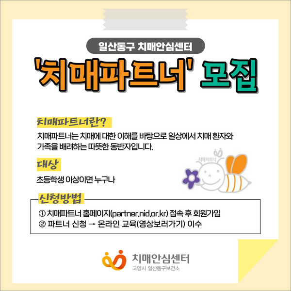 [고양신문] 일산동구 치매안심센터는 지역주민을 대상으로 치매에 대한 부정적 인식 개선을 도모하고, 치매 친화적 지역사회를 조성하기 위해 ‘치매 파트너’를 연중 모집한다. '치매파트너'란 치매에 대한 올바른 이해를 바탕으로 일상에서 치매환자와 가족을 배려하는 따뜻한 동반자라는 취지하에 운영되는 지지활동이다.