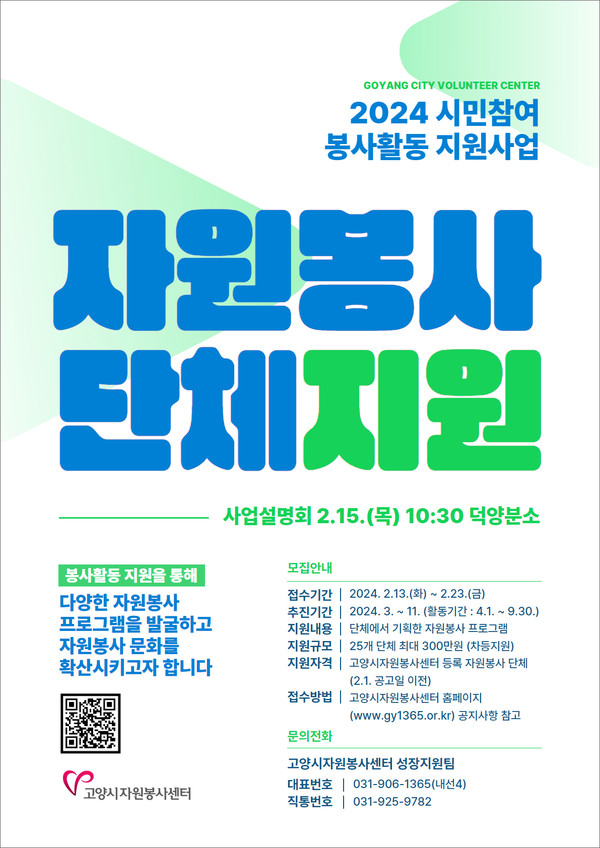 해당 사업과 관련해 오는 2월 15일 오전 10시30분에 고양시자원봉사센터 덕양분소(화중로 104번길 26 한솔타워 10층)에서 사업설명회가 진행된다. 접수 기간 및 접수 방법 등 자세한 사항은 고양시자원봉사센터 누리집(www.gy1365.or.kr) 공지사항에서 확인할 수 있다.